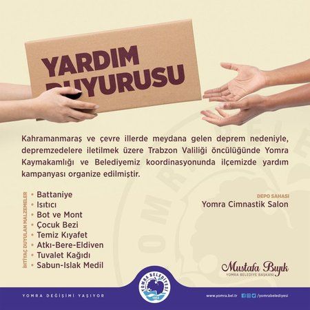 Türkiye, dün geceden itibaren üst üste yaşanan depremler ile mücadele ediyor. Ülkede en az 10 ilde büyük hasarlar meydana geldi. Ülke genelinde yardıma ihtiyacı olan insanlara ulaşabilmek adına çağrılarda bulunuluyor. Bir çağrı da Yomra Belediyesi'nden geldi. Yomra Belediyesi'nden yapılan çağrıda Yomra Jimnastik Salonu'nun yardım toplama alanı haline getirildiğini ve Yomra halkının yardımlarını buraya getirebileceğini aktardı.